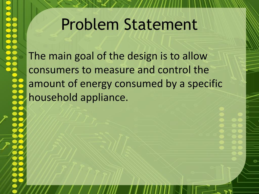 Problem Statement The main goal of the design is to allow consumers to measure and control the amount of energy consumed by a specific household appliance.