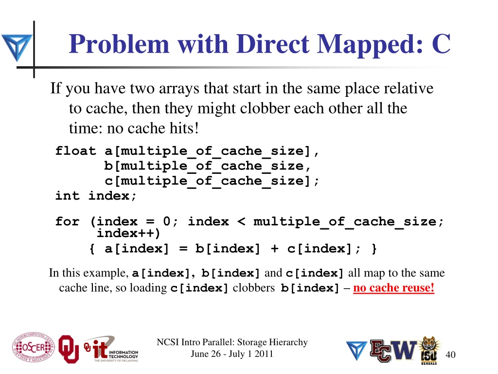 Problem with Direct Mapped: C float a[multiple_of_cache_size], b[multiple_of_cache_size, c[multiple_of_cache_size]; int index; for (index = 0; index < multiple_of_cache_size; index++) { a[index] = b[index] + c[index]; } In this example, a[index], b[index] and c[index] all map to the same cache line, so loading c[index] clobbers b[index] – no cache reuse! NCSI Intro Parallel: Storage Hierarchy June 26 - July 1 2011 If you have two arrays that start in the same place relative to cache, then they might clobber each other all the time: no cache hits!