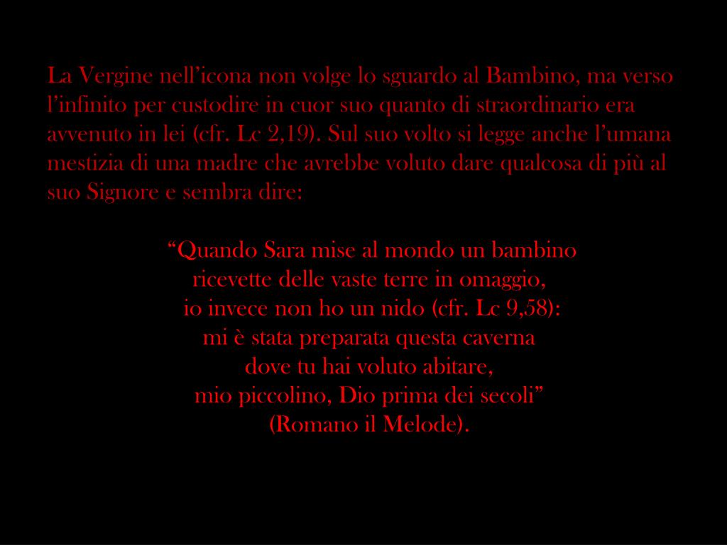 La Vergine nell’icona non volge lo sguardo al Bambino, ma verso l’infinito per custodire in cuor suo quanto di straordinario era avvenuto in lei (cfr. Lc 2,19). Sul suo volto si legge anche l’umana mestizia di una madre che avrebbe voluto dare qualcosa di più al suo Signore e sembra dire: “Quando Sara mise al mondo un bambino ricevette delle vaste terre in omaggio, io invece non ho un nido (cfr. Lc 9,58): mi è stata preparata questa caverna dove tu hai voluto abitare, mio piccolino, Dio prima dei secoli” (Romano il Melode).