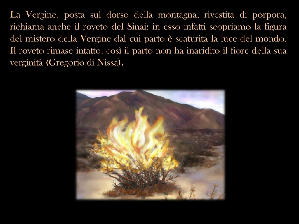 La Vergine, posta sul dorso della montagna, rivestita di porpora, richiama anche il roveto del Sinai: in esso infatti scopriamo la figura del mistero della Vergine dal cui parto è scaturita la luce del mondo. Il roveto rimase intatto, così il parto non ha inaridito il fiore della sua verginità (Gregorio di Nissa).
