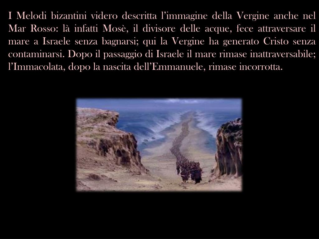 I Melodi bizantini videro descritta l’immagine della Vergine anche nel Mar Rosso: là infatti Mosè, il divisore delle acque, fece attraversare il mare a Israele senza bagnarsi; qui la Vergine ha generato Cristo senza contaminarsi. Dopo il passaggio di Israele il mare rimase inattraversabile; l’Immacolata, dopo la nascita dell’Emmanuele, rimase incorrotta.