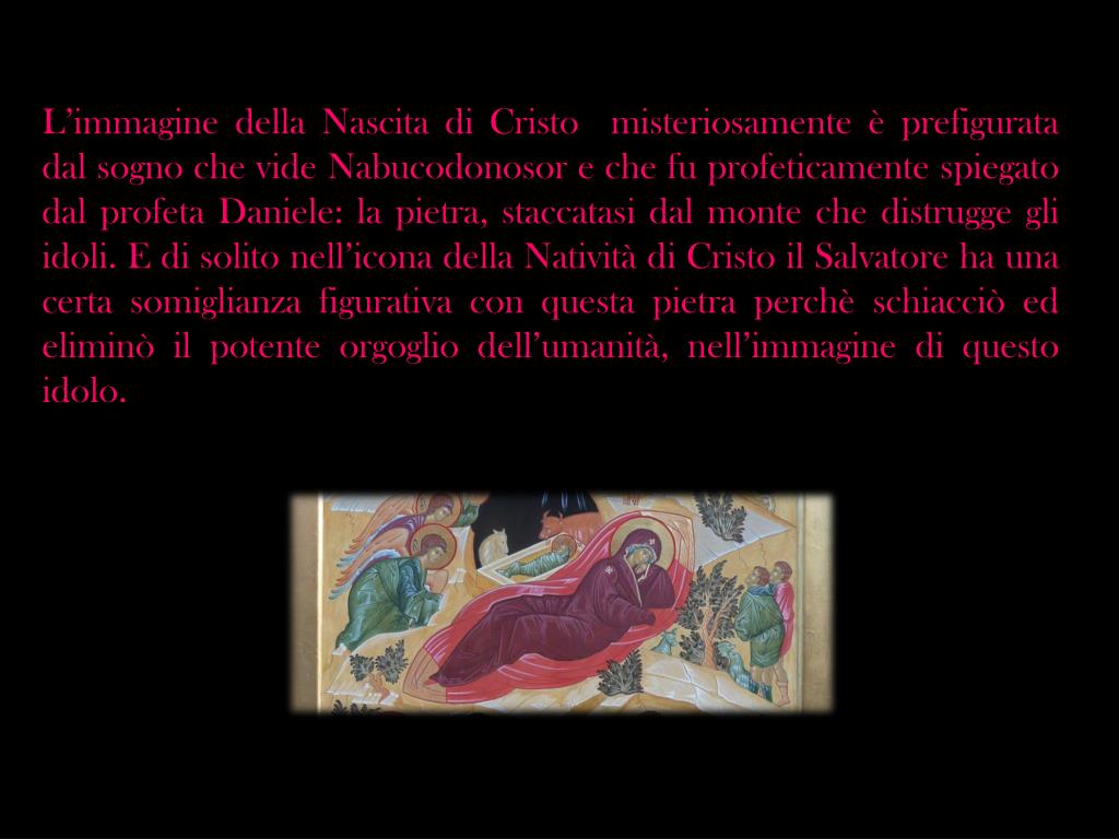 L’immagine della Nascita di Cristo misteriosamente è prefigurata dal sogno che vide Nabucodonosor e che fu profeticamente spiegato dal profeta Daniele: la pietra, staccatasi dal monte che distrugge gli idoli. E di solito nell’icona della Natività di Cristo il Salvatore ha una certa somiglianza figurativa con questa pietra perchèschiacciò ed eliminò il potente orgoglio dell’umanità, nell’immagine di questo idolo.
