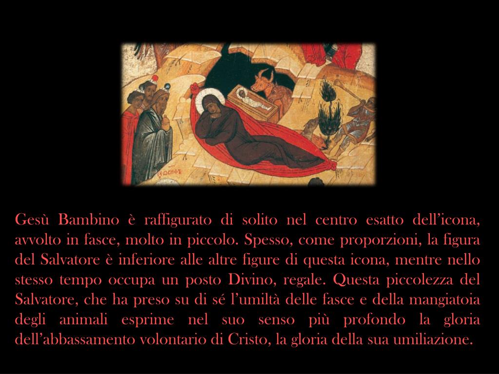 Gesù Bambino è raffigurato di solito nel centro esatto dell’icona, avvolto in fasce, molto in piccolo. Spesso, come proporzioni, la figura del Salvatore è inferiore alle altre figure di questa icona, mentre nello stesso tempo occupa un posto Divino, regale. Questa piccolezza del Salvatore, che ha preso su di sé l’umiltà delle fasce e della mangiatoia degli animali esprime nel suo senso più profondo la gloria dell’abbassamento volontario di Cristo, la gloria della sua umiliazione.