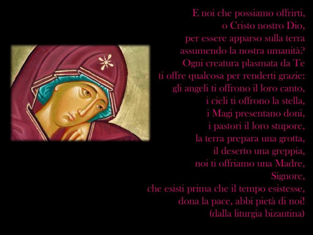 E noi che possiamo offrirti, o Cristo nostro Dio, per essere apparso sulla terra assumendo la nostra umanità? Ogni creatura plasmata da Te ti offre qualcosa per renderti grazie: gli angeli ti offrono il loro canto, i cieli ti offrono la stella, i Magi presentano doni, i pastori il loro stupore, la terra prepara una grotta, il deserto una greppia, noi ti offriamo una Madre, Signore, che esisti prima che il tempo esistesse, dona la pace, abbi pietà di noi! (dalla liturgia bizantina)