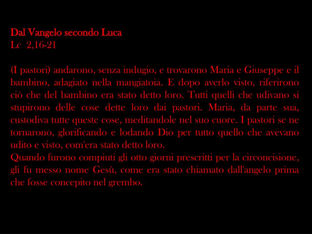 Dal Vangelo secondo Luca Lc2,16-21 (I pastori) andarono, senza indugio, e trovarono Maria e Giuseppe e il bambino, adagiato nella mangiatoia. E dopo averlo visto, riferirono ciò che del bambino era stato detto loro. Tutti quelli che udivano si stupirono delle cose dette loro dai pastori. Maria, da parte sua, custodiva tutte queste cose, meditandole nel suo cuore. I pastori se ne tornarono, glorificando e lodando Dio per tutto quello che avevano udito e visto, com'era stato detto loro. Quando furono compiuti gli otto giorni prescritti per la circoncisione, gli fu messo nome Gesù, come era stato chiamato dall'angelo prima che fosse concepito nel grembo.