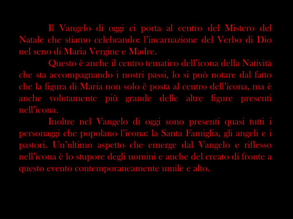 Il Vangelo di oggi ci porta al centro del Mistero del Natale che stiamo celebrando: l’incarnazione del Verbo di Dio nel seno di Maria Vergine e Madre. Questo è anche il centro tematico dell’icona della Natività che sta accompagnando i nostri passi, lo si può notare dal fatto che la figura di Maria non solo è posta al centro dell’icona, ma è anche volutamente più grande delle altre figure presenti nell’icona. Inoltre nel Vangelo di oggi sono presenti quasi tutti i personaggi che popolano l’icona: la Santa Famiglia, gli angeli e i pastori. Un’ultimo aspetto che emerge dal Vangelo e riflesso nell’icona è lo stupore degli uomini e anche del creato di fronte a questo evento contemporaneamente umile e alto.