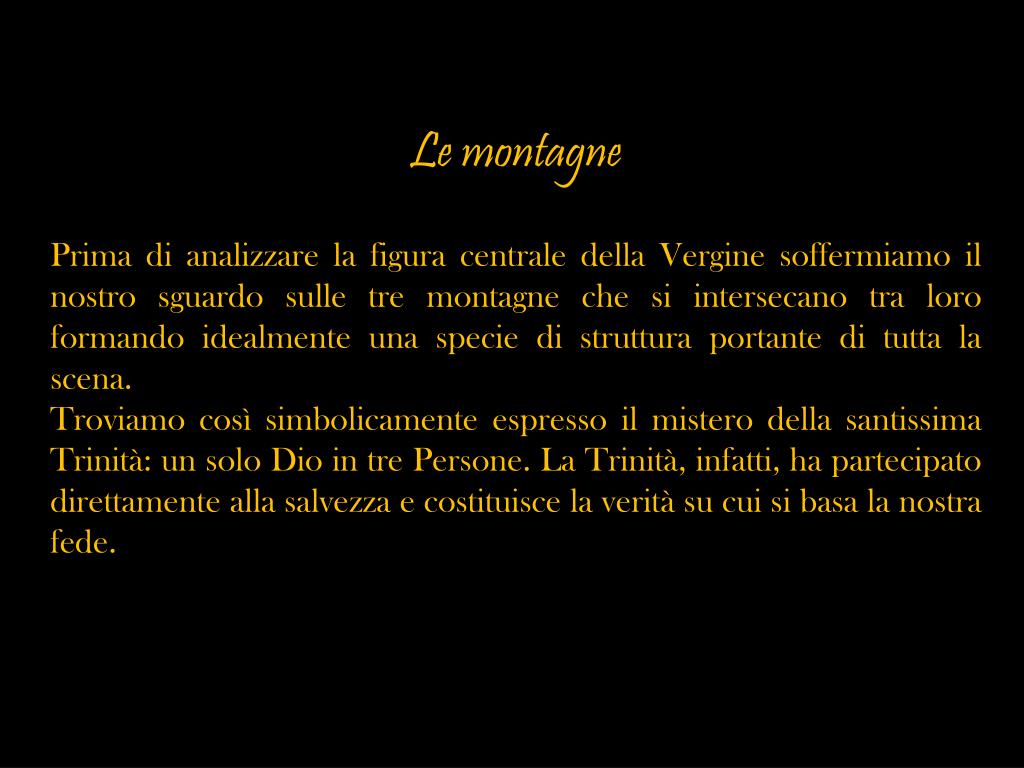 Le montagne Prima di analizzare la figura centrale della Vergine soffermiamo il nostro sguardo sulle tre montagne che si intersecano tra loro formando idealmente una specie di struttura portante di tutta la scena. Troviamo così simbolicamente espresso il mistero della santissima Trinità: un solo Dio in tre Persone. La Trinità, infatti, ha partecipato direttamente alla salvezza e costituisce la verità su cui si basa la nostra fede.