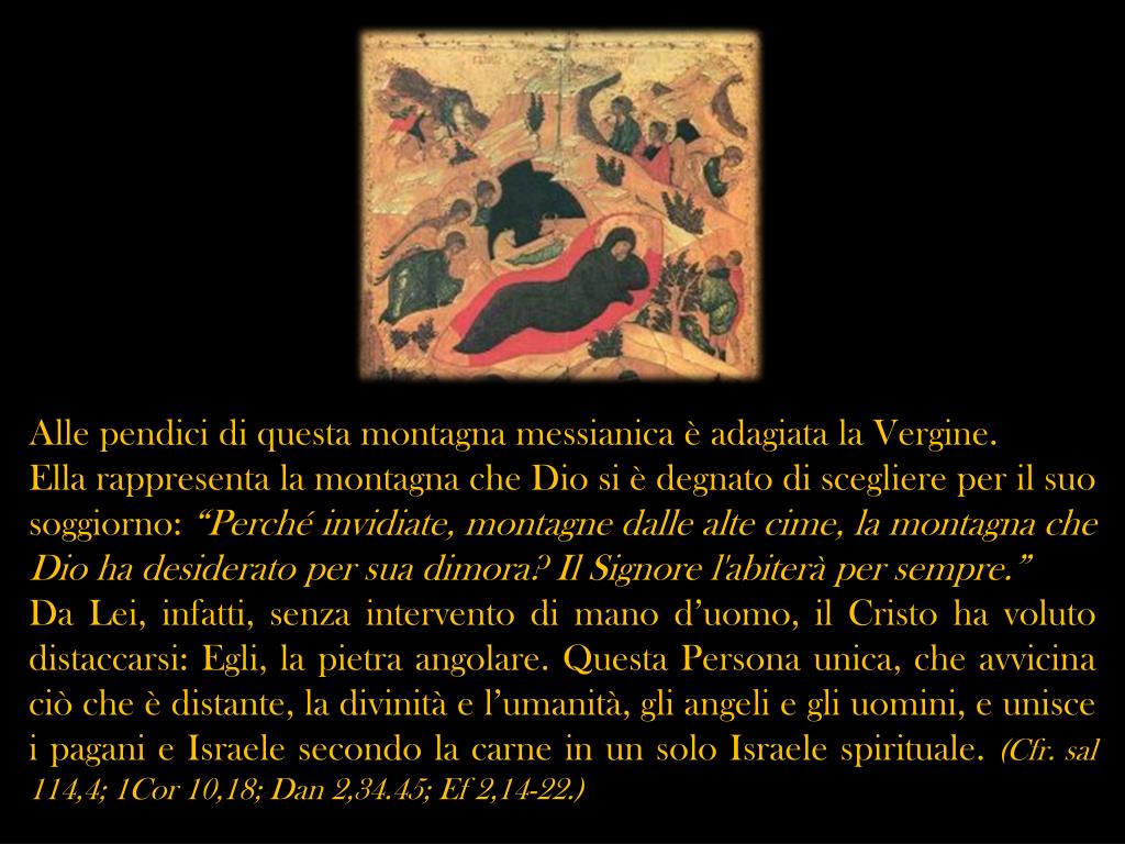 Alle pendici di questa montagna messianica è adagiata la Vergine. Ella rappresenta la montagna che Dio si è degnato di scegliere per il suo soggiorno: “Perché invidiate, montagne dalle alte cime, la montagna che Dio ha desiderato per sua dimora? Il Signore l'abiterà per sempre.” Da Lei, infatti, senza intervento di mano d’uomo, il Cristo ha voluto distaccarsi: Egli, la pietra angolare. Questa Persona unica, che avvicina ciò che è distante, la divinità e l’umanità, gli angeli e gli uomini, e unisce i pagani e Israele secondo la carne in un solo Israele spirituale. (Cfr. sal 114,4; 1Cor 10,18; Dan 2,34.45; Ef2,14-22.)