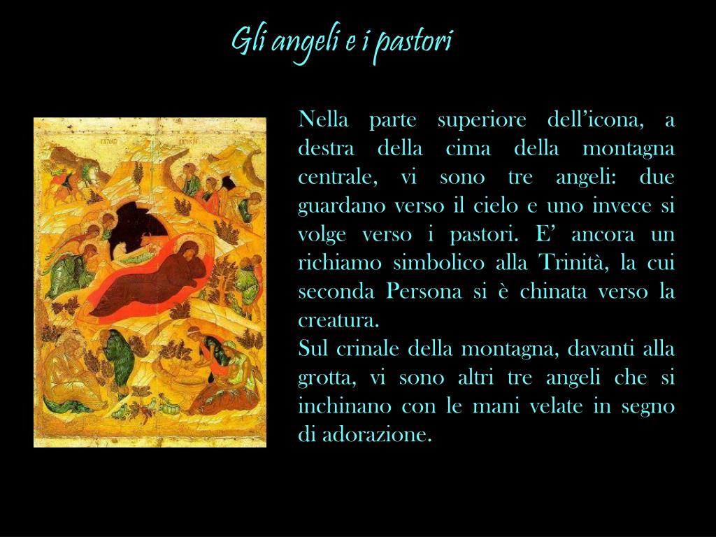 Gli angeli e i pastori Nella parte superiore dell’icona, a destra della cima della montagna centrale, vi sono tre angeli: due guardano verso il cielo e uno invece si volge verso i pastori. E’ ancora un richiamo simbolico alla Trinità, la cui seconda Persona si è chinata verso la creatura. Sul crinale della montagna, davanti alla grotta, vi sono altri tre angeli che si inchinano con le mani velate in segno di adorazione.