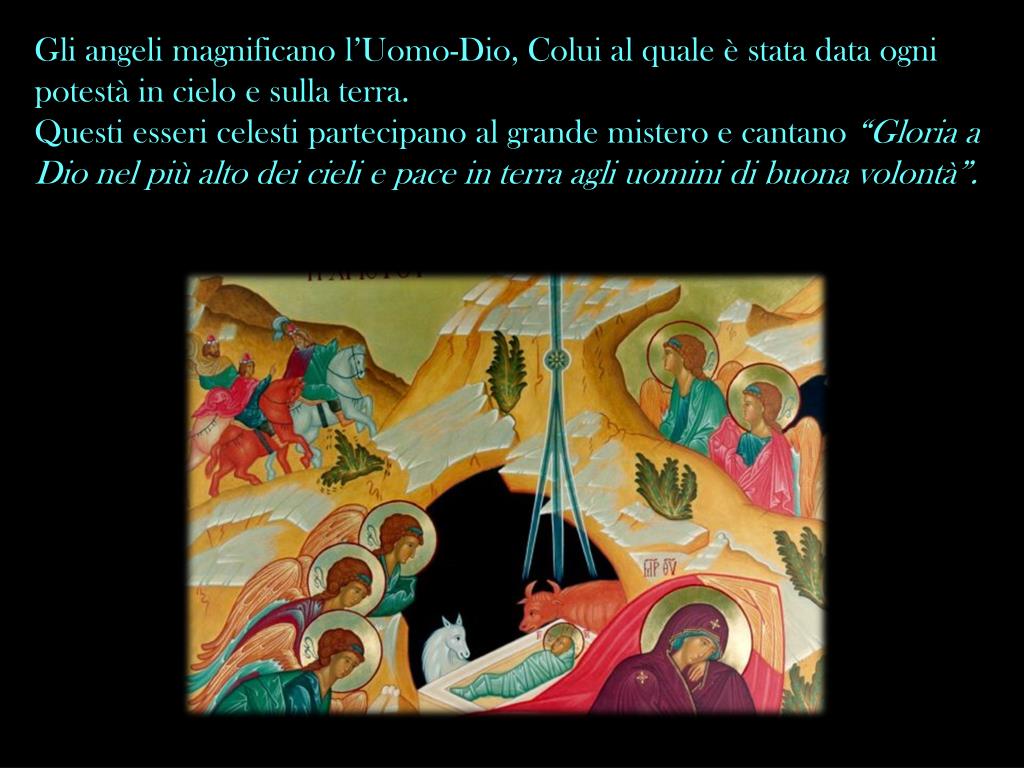 Gli angeli magnificano l’Uomo-Dio, Colui al quale è stata data ogni potestà in cielo e sulla terra. Questi esseri celesti partecipano al grande mistero e cantano “Gloria a Dio nel più alto dei cieli e pace in terra agli uomini di buona volontà”.