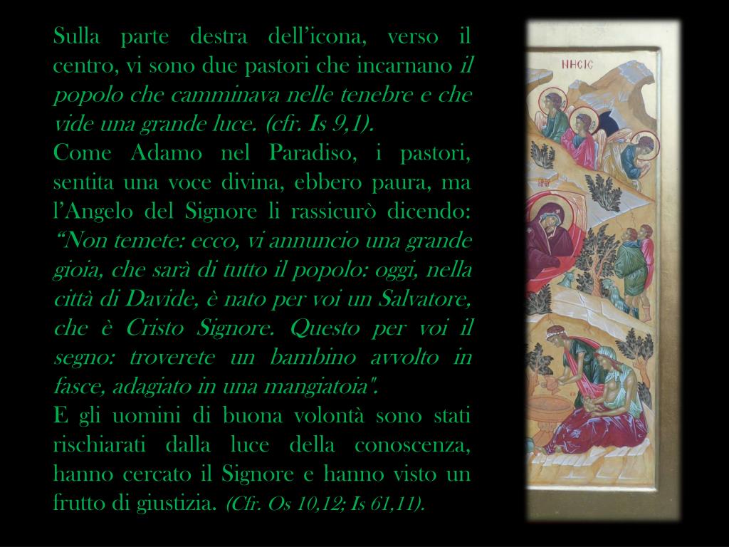 Sulla parte destra dell’icona, verso il centro, vi sono due pastori che incarnano il popolo che camminava nelle tenebre e che vide una grande luce. (cfr. Is 9,1). Come Adamo nel Paradiso, i pastori, sentita una voce divina, ebbero paura, ma l’Angelo del Signore li rassicurò dicendo: “Non temete: ecco, vi annuncio una grande gioia, che sarà di tutto il popolo: oggi, nella città di Davide, è nato per voi un Salvatore, che è Cristo Signore. Questo per voi il segno: troverete un bambino avvolto in fasce, adagiato in una mangiatoia". E gli uomini di buona volontà sono stati rischiarati dalla luce della conoscenza, hanno cercato il Signore e hanno visto un frutto di giustizia. (Cfr. Os10,12; Is 61,11).