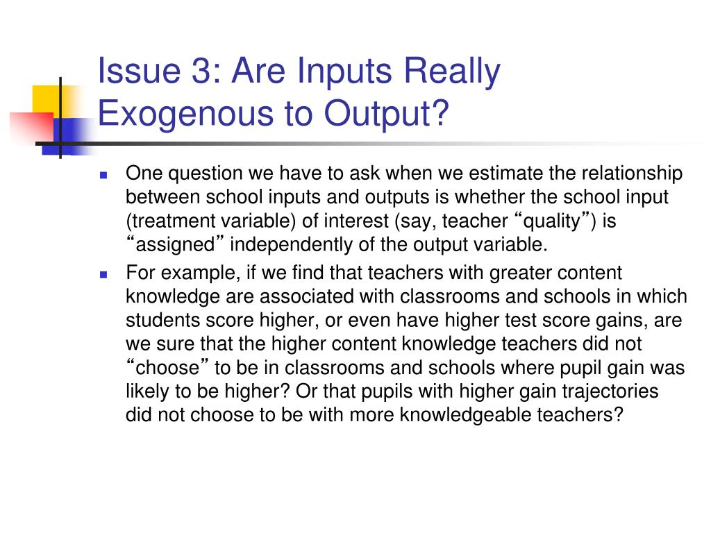 Issue 3: Are Inputs Really Exogenous to Output? • One question we have to ask when we estimate the relationship between school inputs and outputs is whether the school input (treatment variable) of interest (say, teacher “quality”) is “assigned” independently of the output variable. • For example, if we find that teachers with greater content knowledge are associated with classrooms and schools in which students score higher, or even have higher test score gains, are we sure that the higher content knowledge teachers did not “choose” to be in classrooms and schools where pupil gain was likely to be higher? Or that pupils with higher gain trajectories did not choose to be with more knowledgeable teachers?