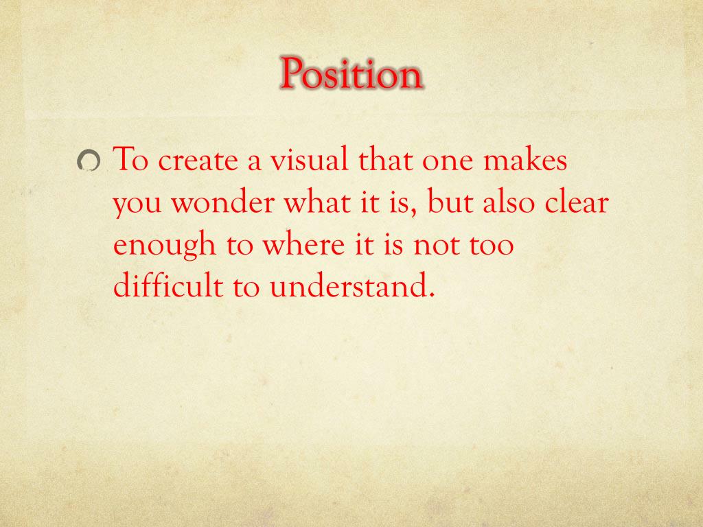 Position • To create a visual that one makes you wonder what it is, but also clear enough to where it is not too difficult to understand.