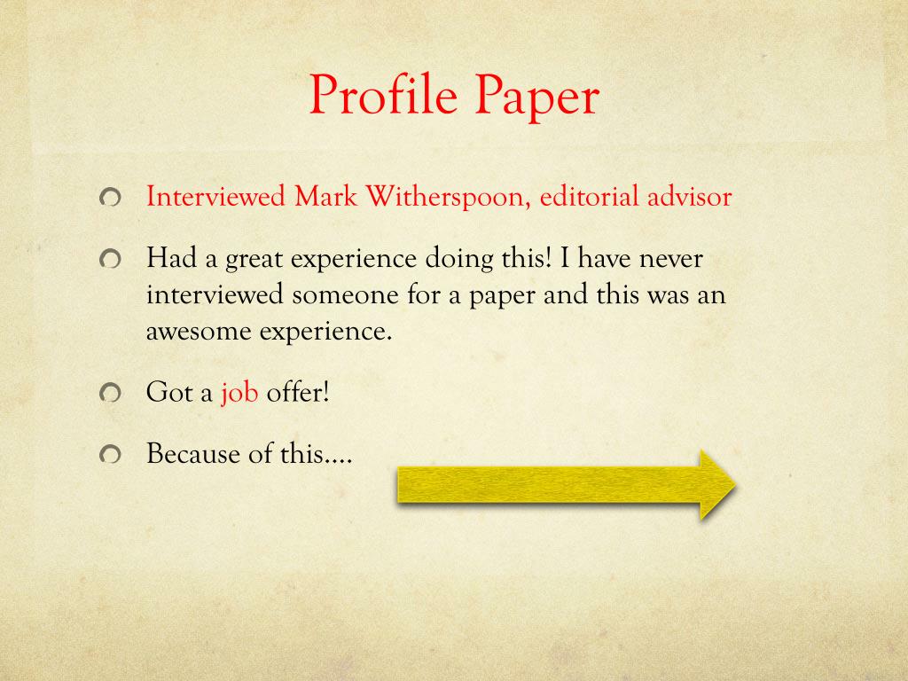 Profile Paper • Interviewed Mark Witherspoon, editorial advisor • Had a great experience doing this! I have never interviewed someone for a paper and this was an awesome experience. • Got a job offer! • Because of this….