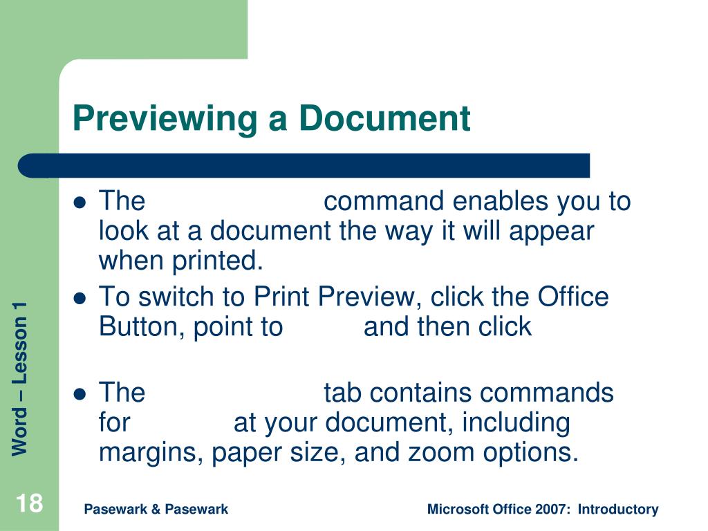 Word Lesson 1 Word Basics. Microsoft Office 2007: Introductory. Objectives. Start Word and identify the parts of the opening screen. Understand the five ways to view your document on the screen. Enter text in a document. Navigate a document.