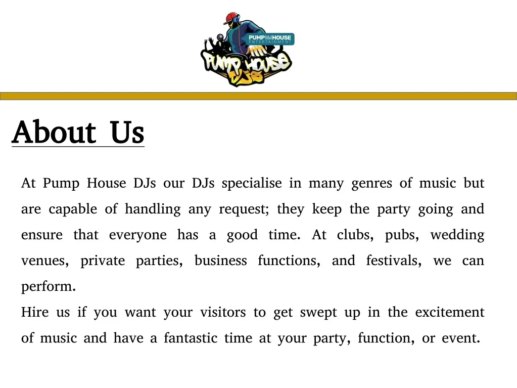 About Us At Pump House DJs our DJs specialise in many genres of music but are capable of handling any request; they keep the party going and ensure that everyone has a good time. At clubs, pubs, wedding venues, private parties, business functions, and festivals, we can perform. Hire us if you want your visitors to get swept up in the excitement of music and have a fantastic time at your party, function, or event.