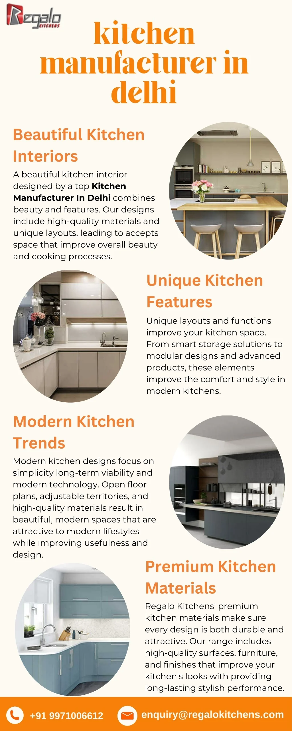 kitchen manufacturer in delhi Beautiful Kitchen Interiors A beautiful kitchen interior designed by a top Kitchen Manufacturer In Delhi combines beauty and features. Our designs include high-quality materials and unique layouts, leading to accepts space that improve overall beauty and cooking processes. Unique Kitchen Features Unique layouts and functions improve your kitchen space. From smart storage solutions to modular designs and advanced products, these elements improve the comfort and style in modern kitchens. Modern Kitchen Trends Modern kitchen designs focus on simplicity long-term viability and modern technology. Open floor plans, adjustable territories, and high-quality materials result in beautiful, modern spaces that are attractive to modern lifestyles while improving usefulness and design. Premium Kitchen Materials Regalo Kitchens' premium kitchen materials make sure every design is both durable and attractive. Our range includes high-quality surfaces, furniture, and finishes that improve your kitchen's looks with providing long-lasting stylish performance. enquiry@regalokitchens.com +91 9971006612