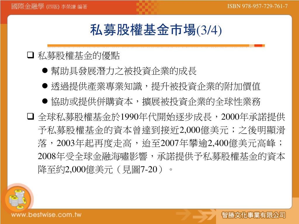 私募股權基金市場(3/4) • 私募股權基金的優點 • 幫助具發展潛力之被投資企業的成長 • 透過提供產業專業知識,提升被投資企業的附加價值 • 協助或提供併購資本,擴展被投資企業的全球性業務 • 全球私募股權基金於1990年代開始逐步成長,2000年承諾提供予私募股權基金的資本曾達到接近2,000億美元;之後明顯滑落,2003年起再度走高,迨至2007年攀逾2,400億美元高峰;2008年受全球金融海嘯影響,承諾提供予私募股權基金的資本降至約2,000億美元(見圖7-20)。
