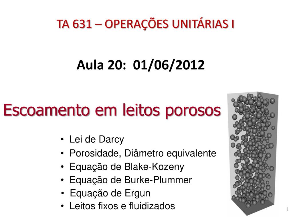TA 631 – OPERAÇÕES UNITÁRIAS I. Aula 20: 01/06/2012. Escoamento em leitos porosos. Lei de Darcy. Porosidade, Diâmetro equivalente. Equação de Blake-Kozeny. Equação de Burke-Plummer. Equação de Ergun. Leitos fixos e fluidizados. 1. Lei de Darcy.