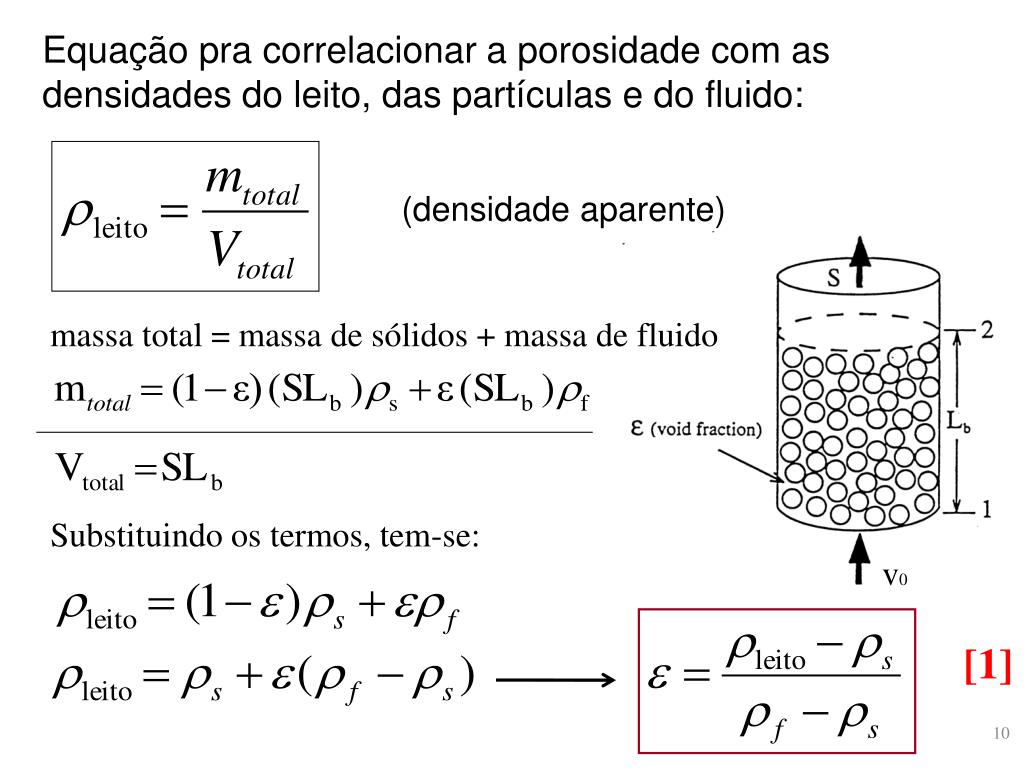 Equação pra correlacionar a porosidade com as densidades do leito, das partículas e do fluido: (densidade aparente) massa total = massa de sólidos + massa de fluido Substituindo os termos, tem-se: v0 [1]