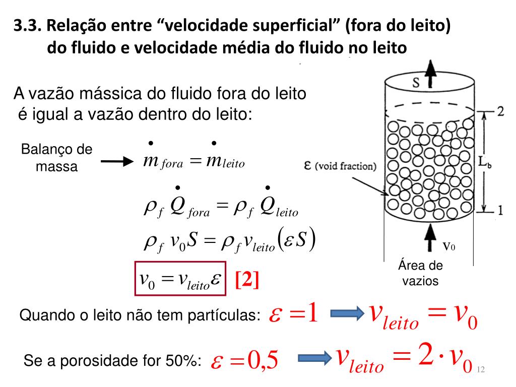 3.3. Relação entre “velocidade superficial” (fora do leito) do fluido e velocidade média do fluido no leito A vazão mássica do fluido fora do leito é igual a vazão dentro do leito: Balanço de massa Área de vazios [2] v0 Quando o leito não tem partículas: Se a porosidade for 50%: