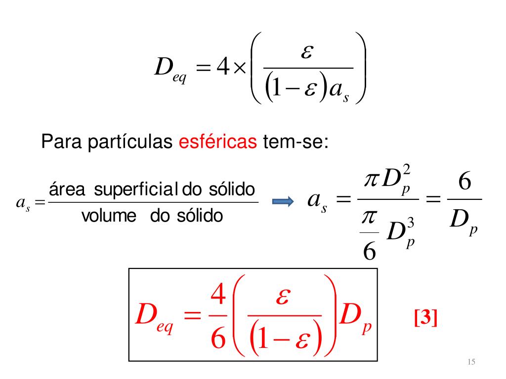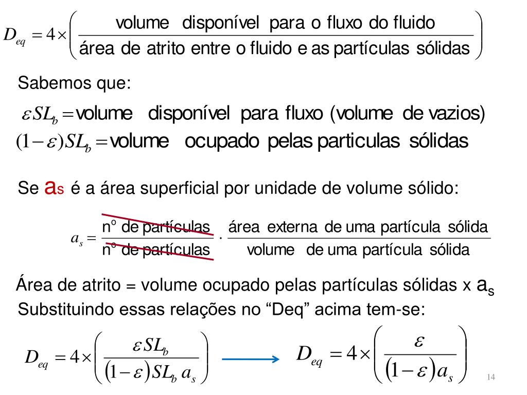 Sabemos que: Se asé a área superficial por unidade de volume sólido: Área de atrito = volume ocupado pelas partículas sólidas x as Substituindo essas relações no “Deq” acima tem-se: