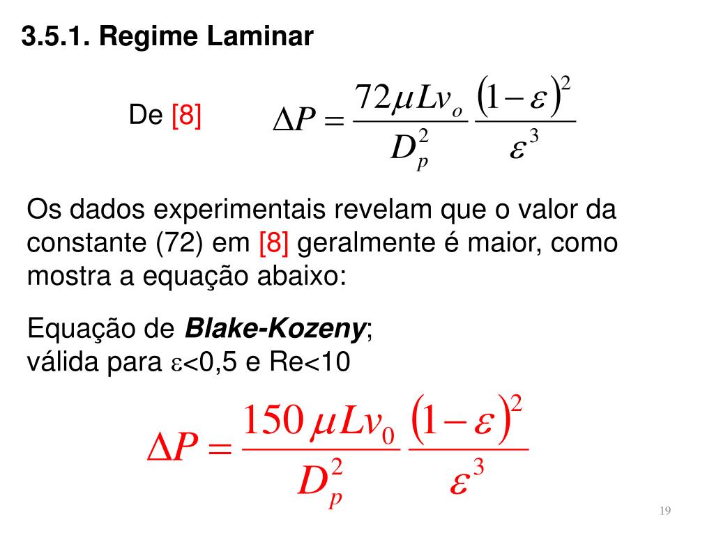 3.5.1. Regime Laminar De [8] Os dados experimentais revelam que o valor da constante (72) em [8] geralmente é maior, como mostra a equação abaixo: Equação de Blake-Kozeny; válida para e<0,5 e Re<10