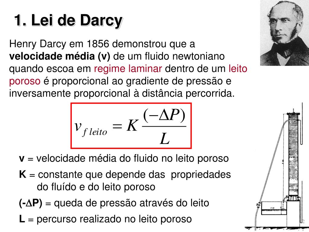 1. Lei de Darcy Henry Darcy em 1856 demonstrou que a velocidade média (v) de um fluido newtoniano quando escoa em regime laminar dentro de um leito poroso é proporcional ao gradiente de pressão e inversamente proporcional à distância percorrida. v = velocidade média do fluido no leito poroso K = constante que depende das propriedades do fluído e do leito poroso (-P) = queda de pressão através do leito L = percurso realizado no leito poroso
