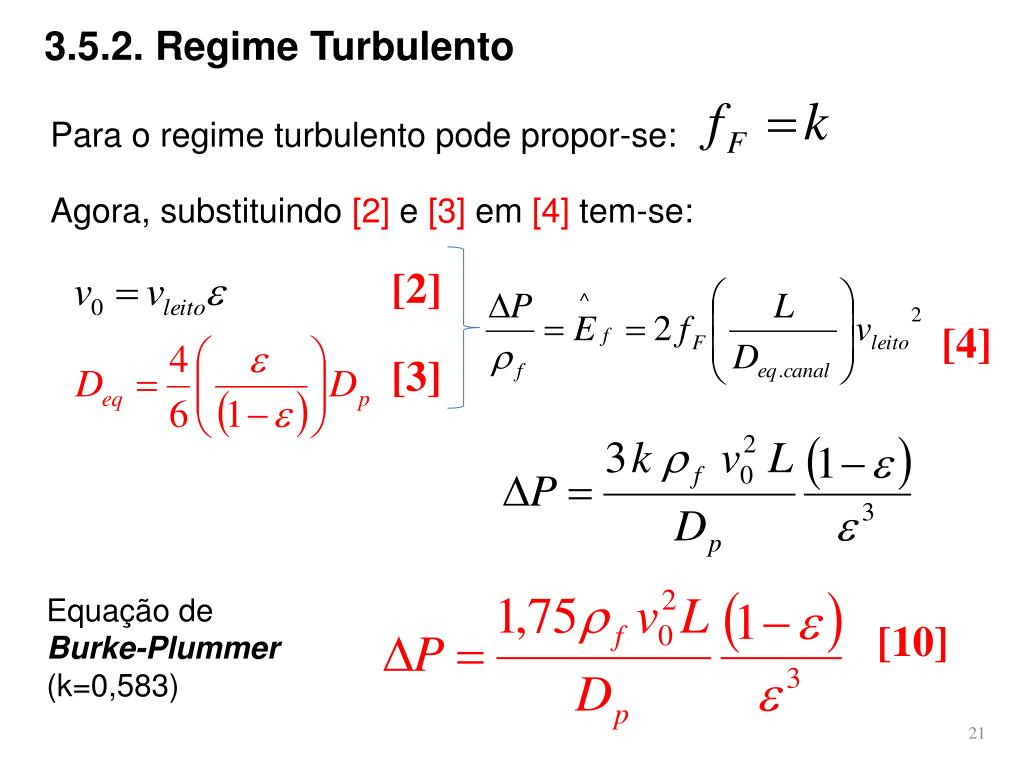 3.5.2. Regime Turbulento Para o regime turbulento pode propor-se: Agora, substituindo [2] e [3] em [4] tem-se: [2] [4] [3] Equação de Burke-Plummer(k=0,583) [10]