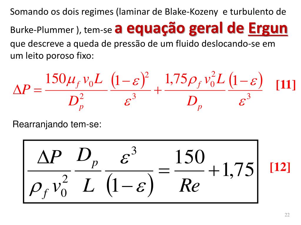 Somando os dois regimes (laminar de Blake-Kozeny e turbulento de Burke-Plummer ), tem-se a equação geral de Ergunque descreve a queda de pressão de um fluido deslocando-se em um leito poroso fixo: [11] Rearranjando tem-se: [12]