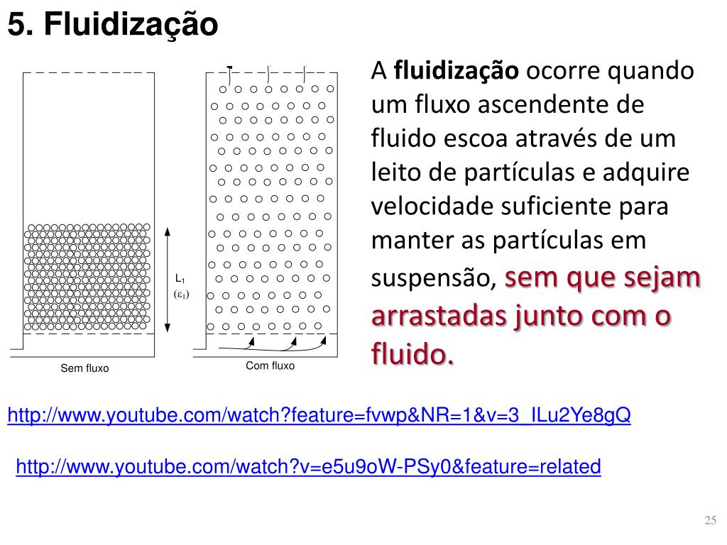 5. Fluidização A fluidização ocorre quando um fluxo ascendente de fluido escoa através de um leito de partículas e adquire velocidade suficiente para manter as partículas em suspensão, sem que sejam arrastadas junto com o fluido. http://www.youtube.com/watch?feature=fvwp&NR=1&v=3_ILu2Ye8gQ http://www.youtube.com/watch?v=e5u9oW-PSy0&feature=related