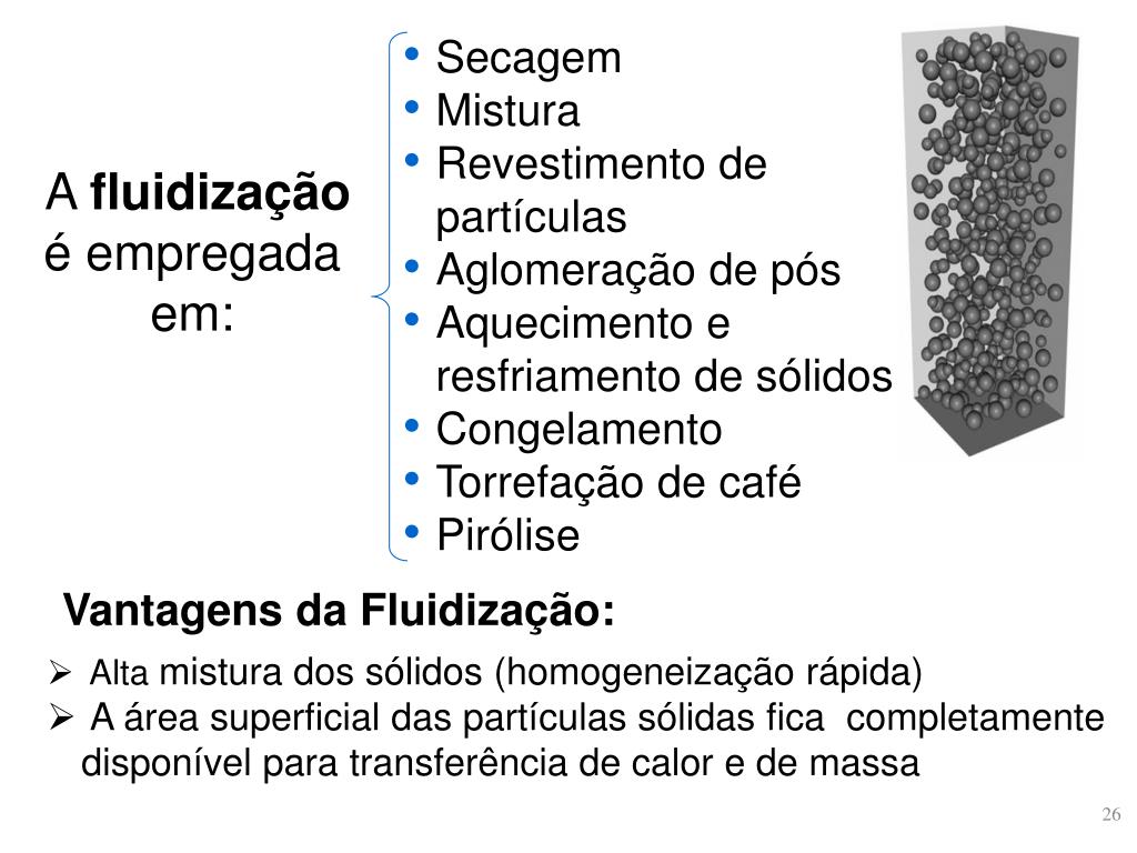 Secagem • Mistura • Revestimento de partículas • Aglomeração de pós • Aquecimento e resfriamento de sólidos • Congelamento • Torrefação de café • Pirólise A fluidização é empregada em: Vantagens da Fluidização: • Alta mistura dos sólidos (homogeneização rápida) • A área superficial das partículas sólidas fica completamente disponível para transferência de calor e de massa