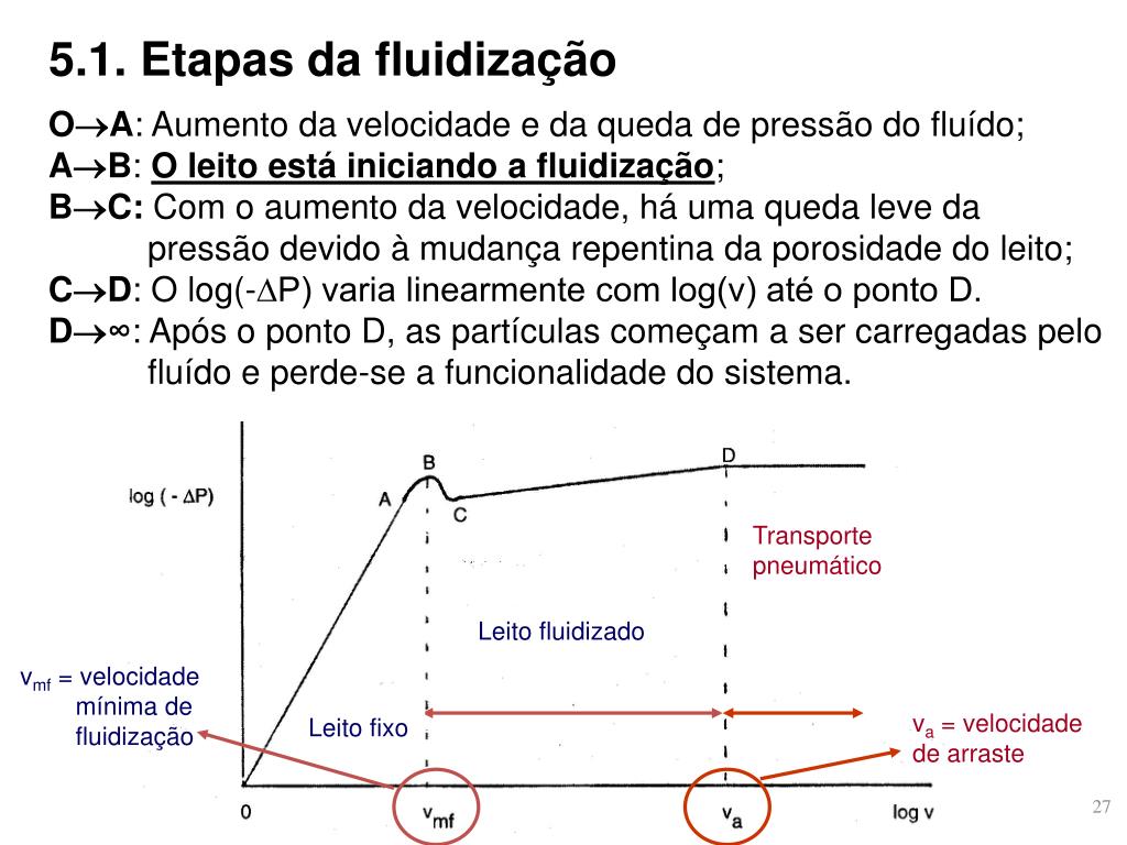 5.1. Etapas da fluidização OA: Aumento da velocidade e da queda de pressão do fluído; AB: O leito está iniciando a fluidização; BC: Com o aumento da velocidade, há uma queda leve da pressão devido à mudança repentina da porosidade do leito; CD: O log(-∆P) varia linearmente com log(v) até o ponto D. D∞: Após o ponto D, as partículas começam a ser carregadas pelo fluído e perde-se a funcionalidade do sistema. Transporte pneumático Leito fluidizado vmf = velocidade mínima de fluidização va = velocidade de arraste Leito fixo
