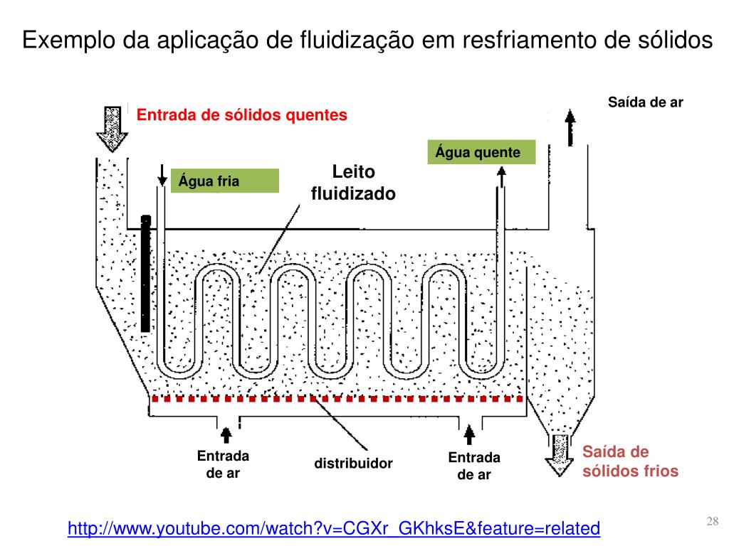 Exemplo da aplicação de fluidização em resfriamento de sólidos Saída de ar Entrada de sólidos quentes Água quente Leito fluidizado Água fria Saída de sólidos frios Entrada de ar Entrada de ar distribuidor http://www.youtube.com/watch?v=CGXr_GKhksE&feature=related