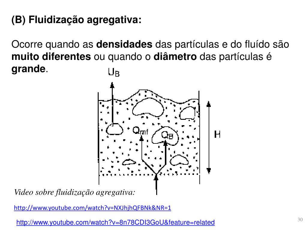 (B) Fluidização agregativa: Ocorre quando as densidades das partículas e do fluído são muito diferentes ou quando o diâmetro das partículas é grande. Video sobre fluidização agregativa: http://www.youtube.com/watch?v=NXJhjhQFBNk&NR=1 http://www.youtube.com/watch?v=8n78CDI3GoU&feature=related
