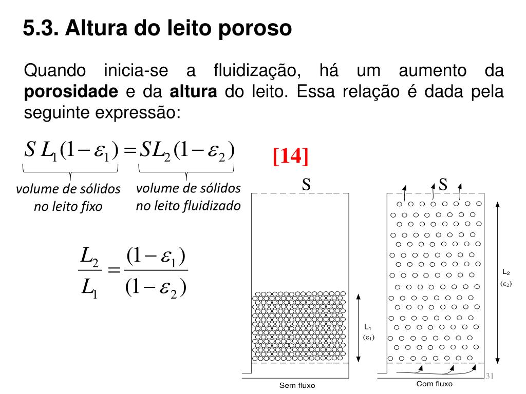 5.3. Altura do leito poroso Quando inicia-se a fluidização, há um aumento da porosidade e da altura do leito. Essa relação é dada pela seguinte expressão: [14] S S volume de sólidos no leito fluidizado volume de sólidos no leito fixo