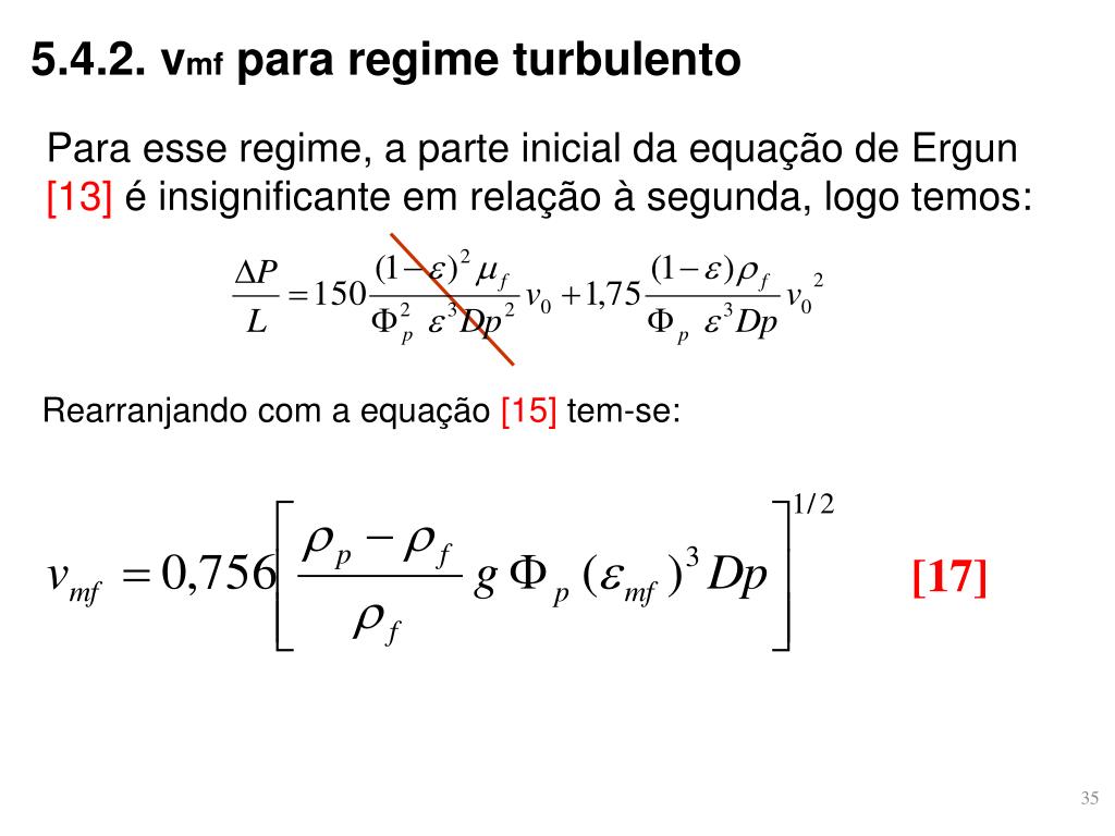 5.4.2. vmf para regime turbulento Para esse regime, a parte inicial da equação de Ergun [13] é insignificante em relação à segunda, logo temos: Rearranjando com a equação [15] tem-se: [17]