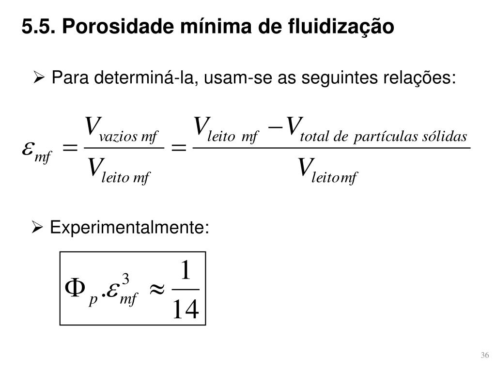 5.5. Porosidade mínima de fluidização • Para determiná-la, usam-se as seguintes relações: • Experimentalmente: