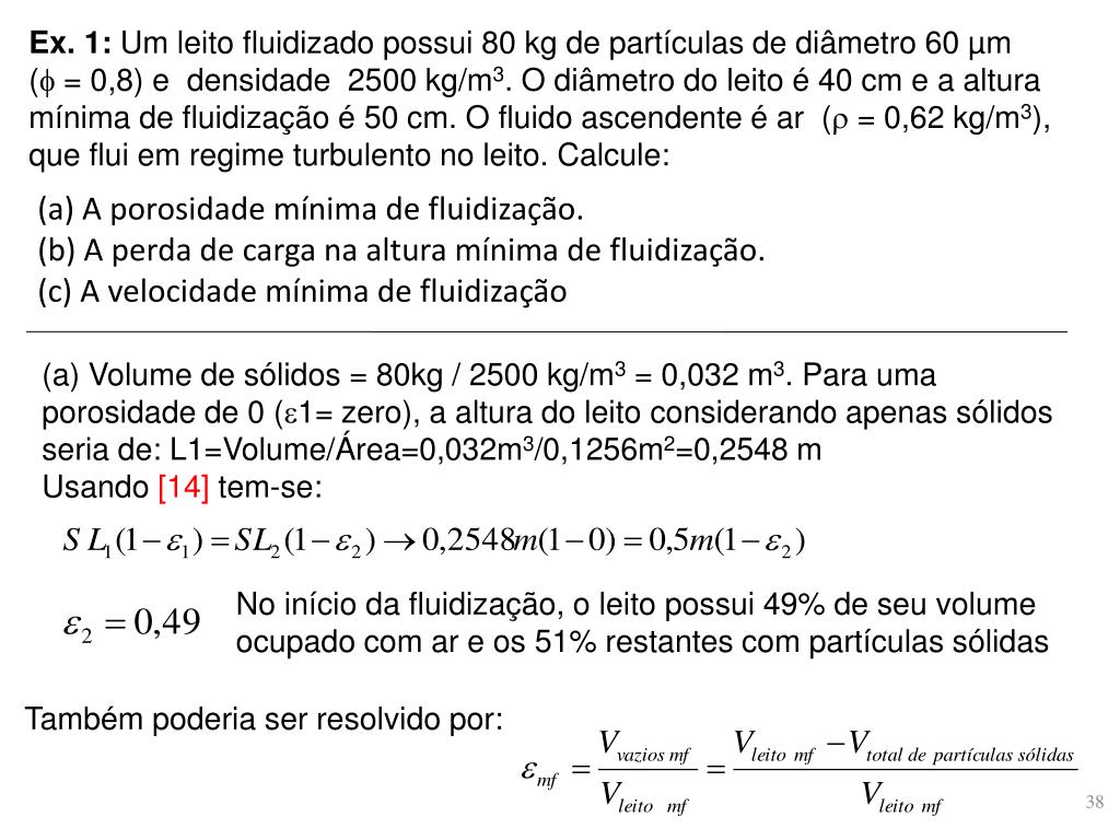 Ex. 1: Um leito fluidizado possui 80 kg de partículas de diâmetro 60 µm ( = 0,8) e densidade 2500 kg/m3. O diâmetro do leito é 40 cm e a altura mínima de fluidização é 50 cm. O fluido ascendente é ar ( = 0,62 kg/m3), que flui em regime turbulento no leito. Calcule: (a) A porosidade mínima de fluidização. (b) A perda de carga na altura mínima de fluidização. (c) A velocidade mínima de fluidização (a) Volume de sólidos = 80kg / 2500 kg/m3 = 0,032 m3. Para uma porosidade de 0 (1= zero), a altura do leito considerando apenas sólidos seria de: L1=Volume/Área=0,032m3/0,1256m2=0,2548 m Usando [14] tem-se: No início da fluidização, o leito possui 49% de seu volume ocupado com ar e os 51% restantes com partículas sólidas Também poderia ser resolvido por: