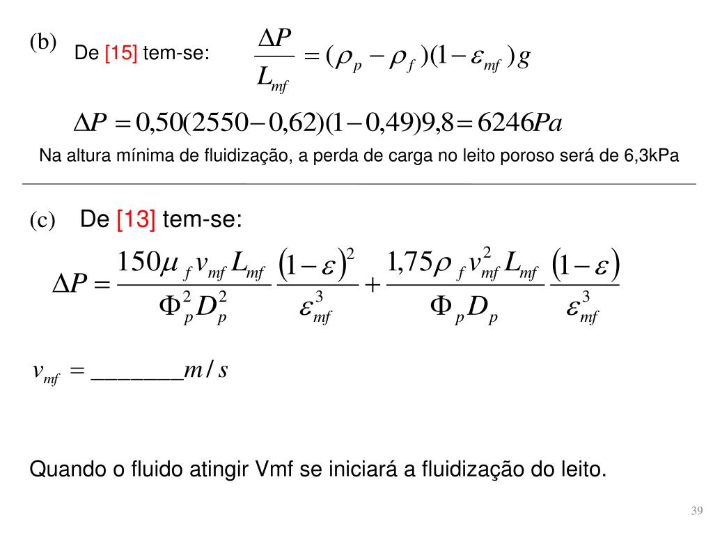 (b) De [15] tem-se: Na altura mínima de fluidização, a perda de carga no leito poroso será de 6,3kPa De [13] tem-se: (c) Quando o fluido atingir Vmf se iniciará a fluidização do leito.