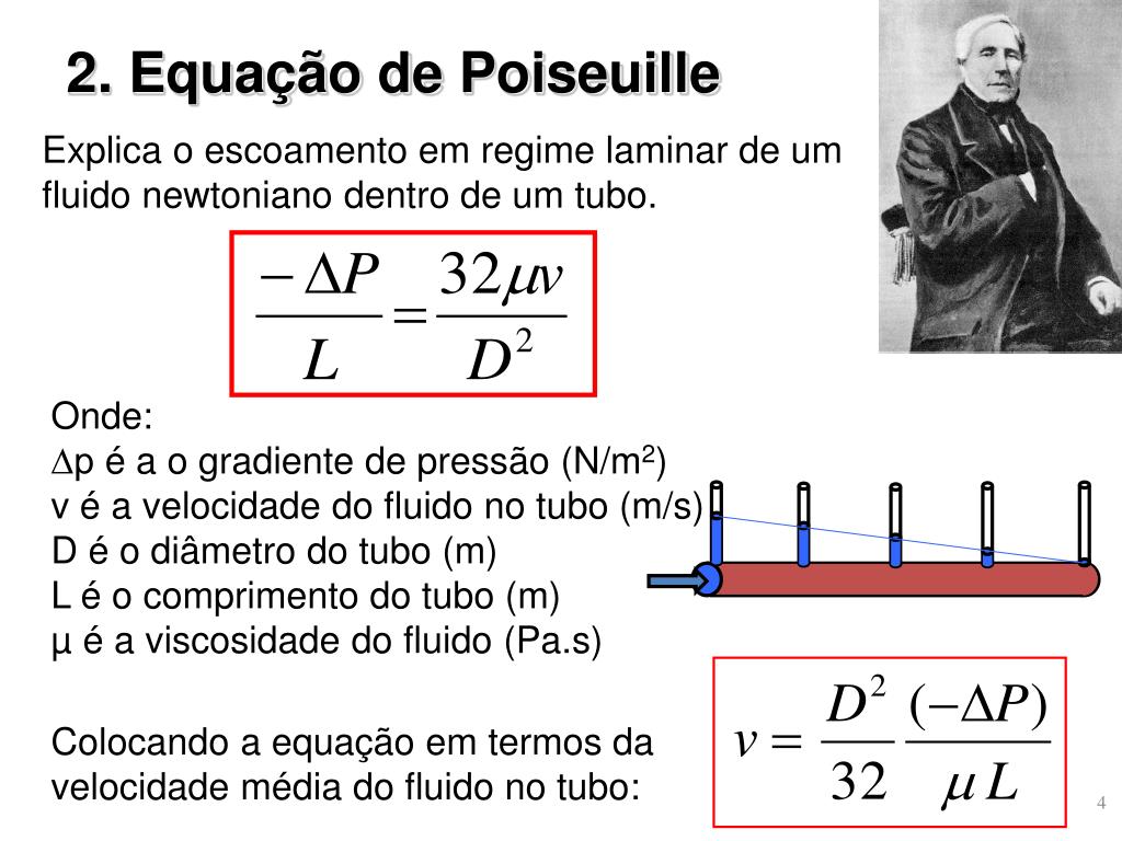 2. Equação de Poiseuille Explica o escoamento em regime laminar de um fluido newtoniano dentro de um tubo. Onde: ∆p é a o gradiente de pressão (N/m2) v é a velocidade do fluido no tubo (m/s) D é o diâmetro do tubo (m) L é o comprimento do tubo (m) µ é a viscosidade do fluido (Pa.s) Colocando a equação em termos da velocidade média do fluido no tubo: