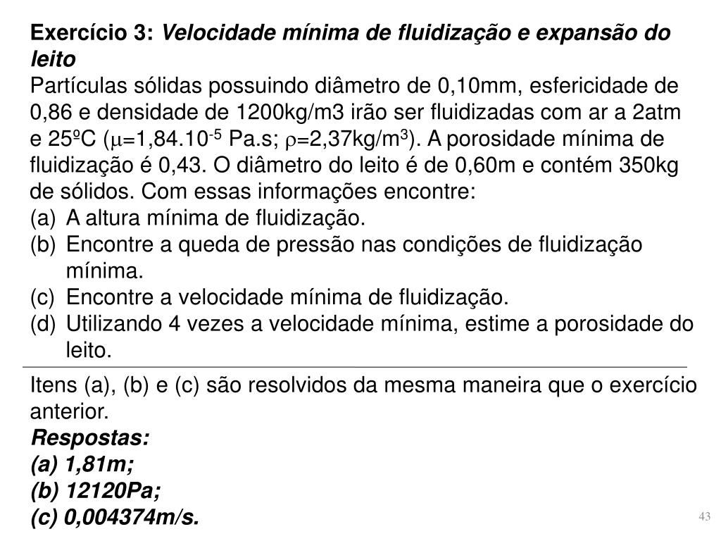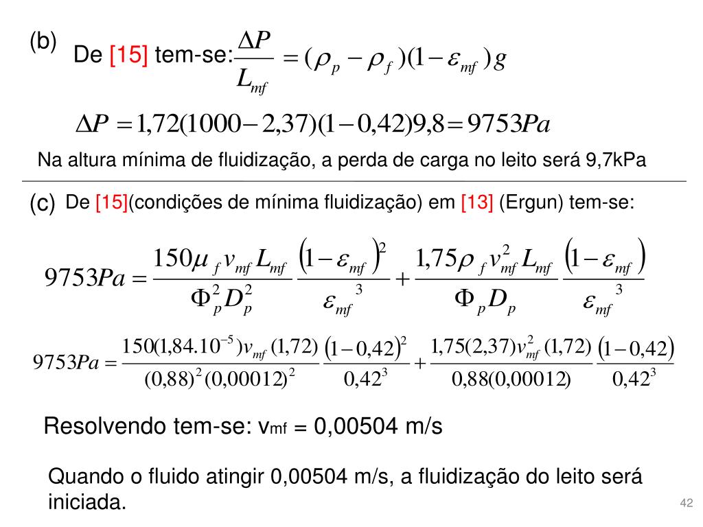 (b) De [15] tem-se: Na altura mínima de fluidização, a perda de carga no leito será 9,7kPa (c) De [15](condições de mínima fluidização) em [13] (Ergun) tem-se: Resolvendo tem-se: vmf = 0,00504 m/s Quando o fluido atingir 0,00504 m/s, a fluidização do leito será iniciada.