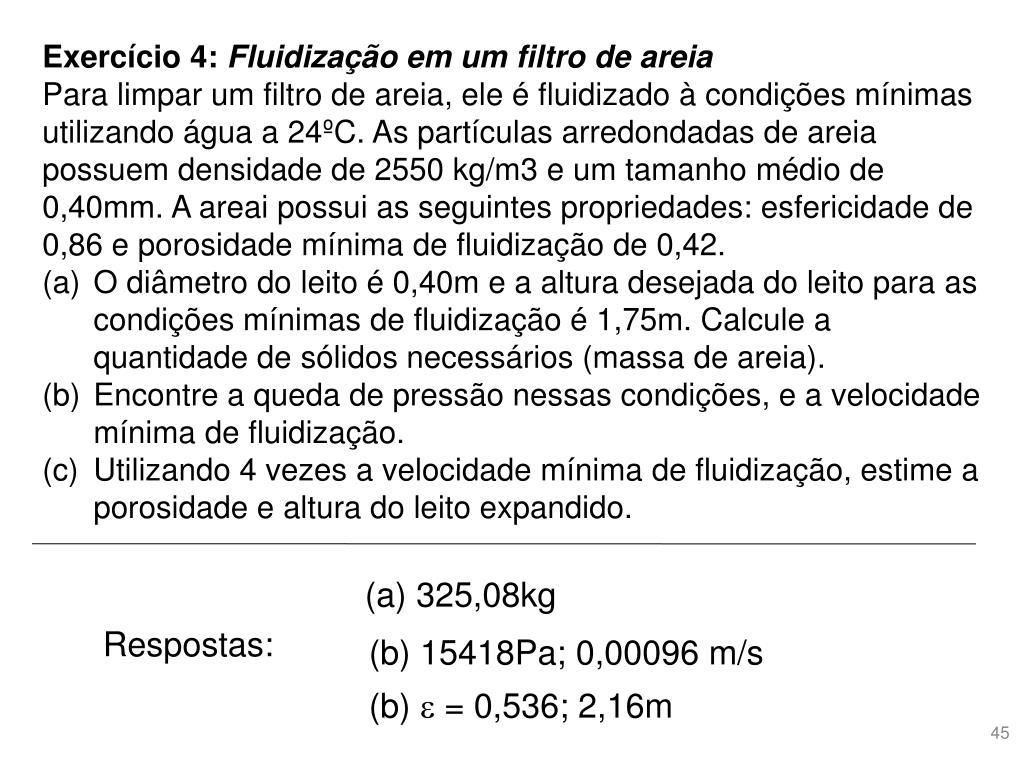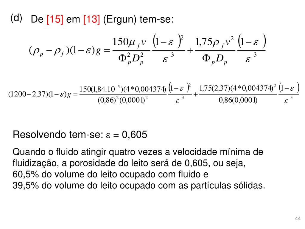 (d) De [15] em [13] (Ergun) tem-se: Resolvendo tem-se: = 0,605 Quando o fluido atingir quatro vezes a velocidade mínima de fluidização, a porosidade do leito será de 0,605, ou seja, 60,5% do volume do leito ocupado com fluido e 39,5% do volume do leito ocupado com as partículas sólidas.