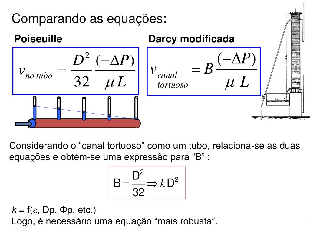 Comparando as equações: Poiseuille Darcy modificada Considerando o “canal tortuoso” como um tubo, relaciona-se as duas equações e obtém-se uma expressão para “B” : k = f(, Dp, Φp, etc.) Logo, é necessário uma equação “mais robusta”.