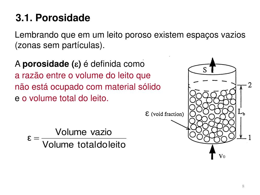 3.1. Porosidade Lembrando que em um leito poroso existem espaços vazios (zonas sem partículas). A porosidade()é definida comoa razão entre o volume do leito que não está ocupado com material sólido e o volume total do leito. v0