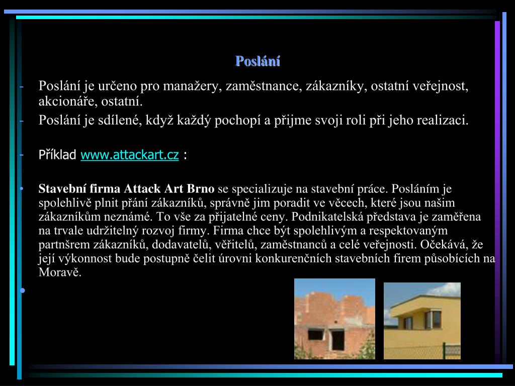 Poslání • Poslání je určeno pro manažery, zaměstnance, zákazníky, ostatní veřejnost, akcionáře, ostatní. • Poslání je sdílené, když každý pochopí a přijme svoji roli při jeho realizaci. • Příklad www.attackart.cz : • Stavební firmaAttack ArtBrno se specializuje na stavební práce. Posláním je spolehlivě plnit přání zákazníků, správně jim poradit ve věcech, které jsou našim zákazníkům neznámé. To vše za přijatelné ceny. Podnikatelská představa je zaměřena na trvale udržitelný rozvoj firmy. Firma chce být spolehlivým a respektovaným partnšrem zákazníků, dodavatelů, věřitelů, zaměstnanců a celé veřejnosti. Očekává, že její výkonnost bude postupně čelit úrovni konkurenčních stavebních firem působících na Moravě.