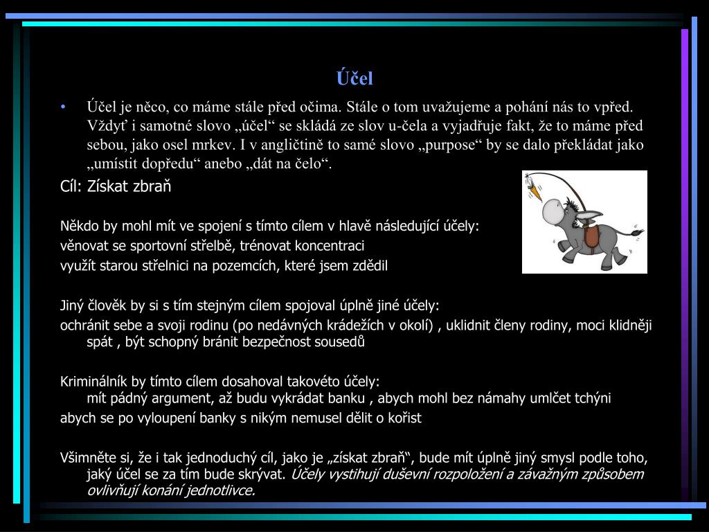 Účel • Účel je něco, co máme stále před očima. Stále o tom uvažujeme a pohání nás to vpřed. Vždyť i samotné slovo „účel“ se skládá ze slov u-čela a vyjadřuje fakt, že to máme před sebou, jako osel mrkev. I v angličtině to samé slovo „purpose“ by se dalo překládat jako „umístit dopředu“ anebo „dát na čelo“. Cíl: Získat zbraň Někdo by mohl mít ve spojení s tímto cílem v hlavě následující účely: věnovat se sportovní střelbě, trénovat koncentraci využít starou střelnici na pozemcích, které jsem zdědil Jiný člověk by si s tím stejným cílem spojoval úplně jiné účely: ochránit sebe a svoji rodinu (po nedávných krádežích v okolí) , uklidnit členy rodiny, moci klidněji spát , být schopný bránit bezpečnost sousedů Kriminálník by tímto cílem dosahoval takovéto účely: mít pádný argument, až budu vykrádat banku , abych mohl bez námahy umlčet tchýni abych se po vyloupení banky s nikým nemusel dělit o kořist Všimněte si, že i tak jednoduchý cíl, jako je „získat zbraň“, bude mít úplně jiný smysl podle toho, jaký účel se za tím bude skrývat. Účely vystihují duševní rozpoložení a závažným způsobem ovlivňují konání jednotlivce.