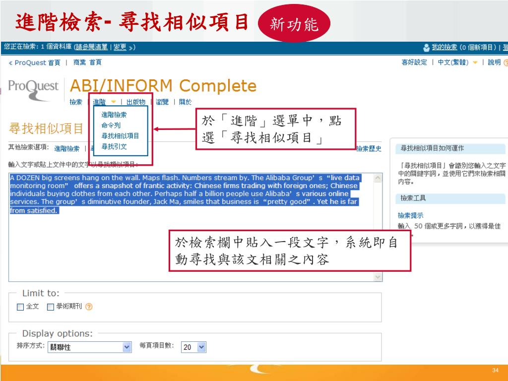 於「進階」選單中,點選「尋找相似項目」 進階檢索- 尋找相似項目 新功能 於檢索欄中貼入一段文字,系統即自動尋找與該文相關之內容 34