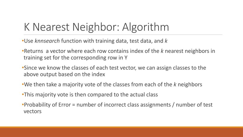 K Nearest Neighbor: Algorithm • Use knnsearch function with training data, test data, and k • Returns a vector where each row contains index of the k nearest neighbors in training set for the corresponding row in Y • Since we know the classes of each test vector, we can assign classes to the above output based on the index • We then take a majority vote of the classes from each of the k neighbors • This majority vote is then compared to the actual class • Probability of Error = number of incorrect class assignments / number of test vectors