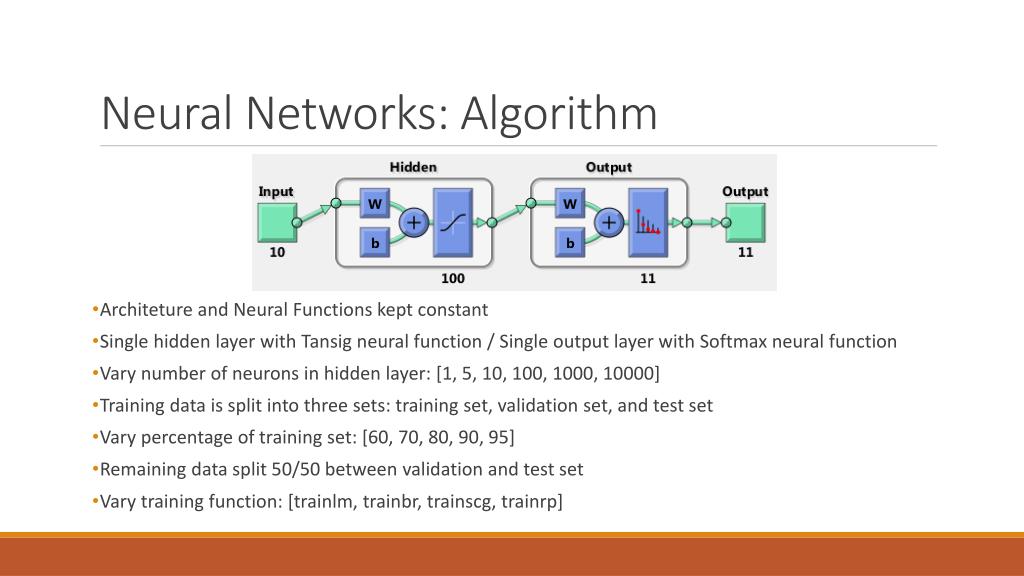 Neural Networks: Algorithm • Architeture and Neural Functions kept constant • Single hidden layer with Tansig neural function / Single output layer with Softmax neural function • Vary number of neurons in hidden layer: [1, 5, 10, 100, 1000, 10000] • Training data is split into three sets: training set, validation set, and test set • Vary percentage of training set: [60, 70, 80, 90, 95] • Remaining data split 50/50 between validation and test set • Vary training function: [trainlm, trainbr, trainscg, trainrp]